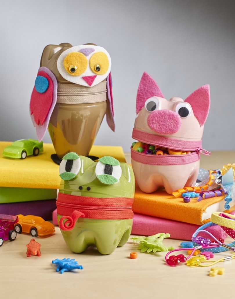 Надо лишь обклеить объект цветной бумагой или разрисовать. Мишки, зайки, осьминожки получаются просто великолепными поделками из бросового материала в школу.