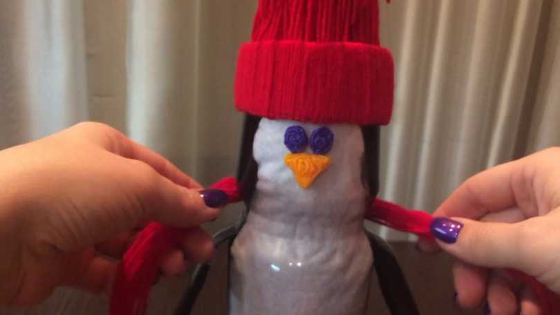 Эта забавная поделка делается крайне просто: внутрь бутылки размещаются шарики ваты. На внешнюю часть бутылки приклеиваем нос, рот и глазки. Утепляем снеговичка фетровым шарфиком — поделка готова.