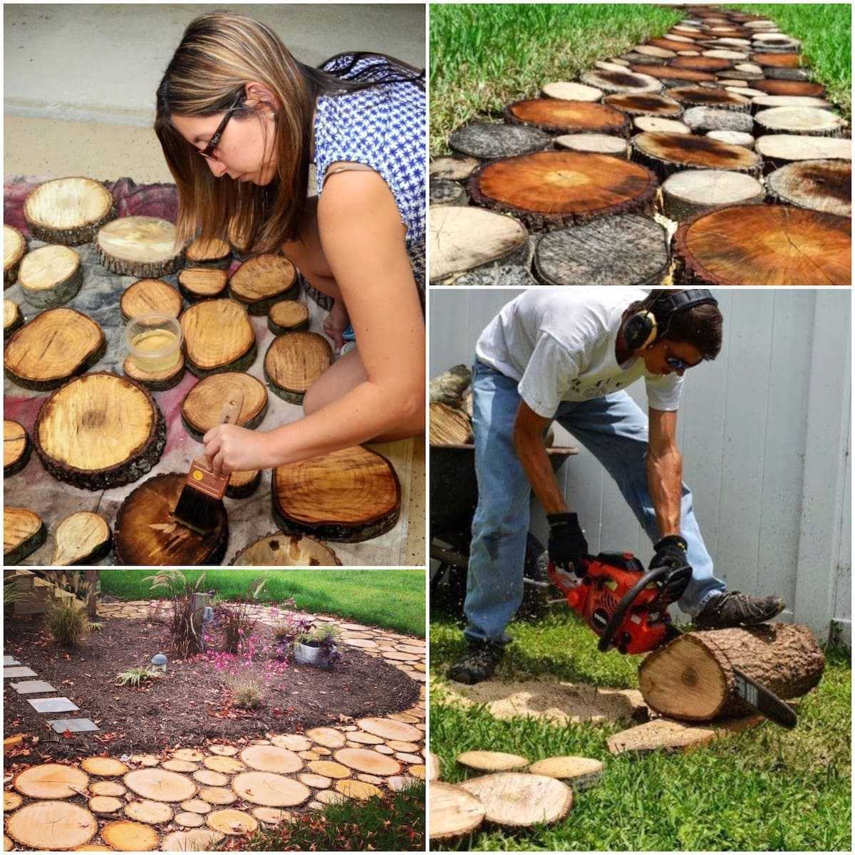 При обустройстве дорожек используют качественный проверенный материал, без порчи и дефектов. Для основы дорожки можно выбрать песок, уложив спилы разной формы и диаметра. В качестве декора лучше использовать камни и вьющиеся растения.