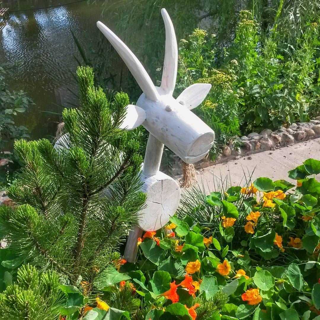Очень красивыми получаются фигурки животных или птиц, сделанные из дерева. Чаще всего на приусадебных участках можно увидеть сову, являющуюся символом мудрости. Особо эффектно смотрится такая поделка из бревна, так как древесный рисунок будет отлично имитировать перья совы. Наиболее интересно получается фигурка совы с круглыми глазами, сидящей столбиком или с распростертыми крыльями. Но такие поделки требуют большего опыта работы с деревом. В качестве дополнительного украшения изделие покрывают лаком или краской.