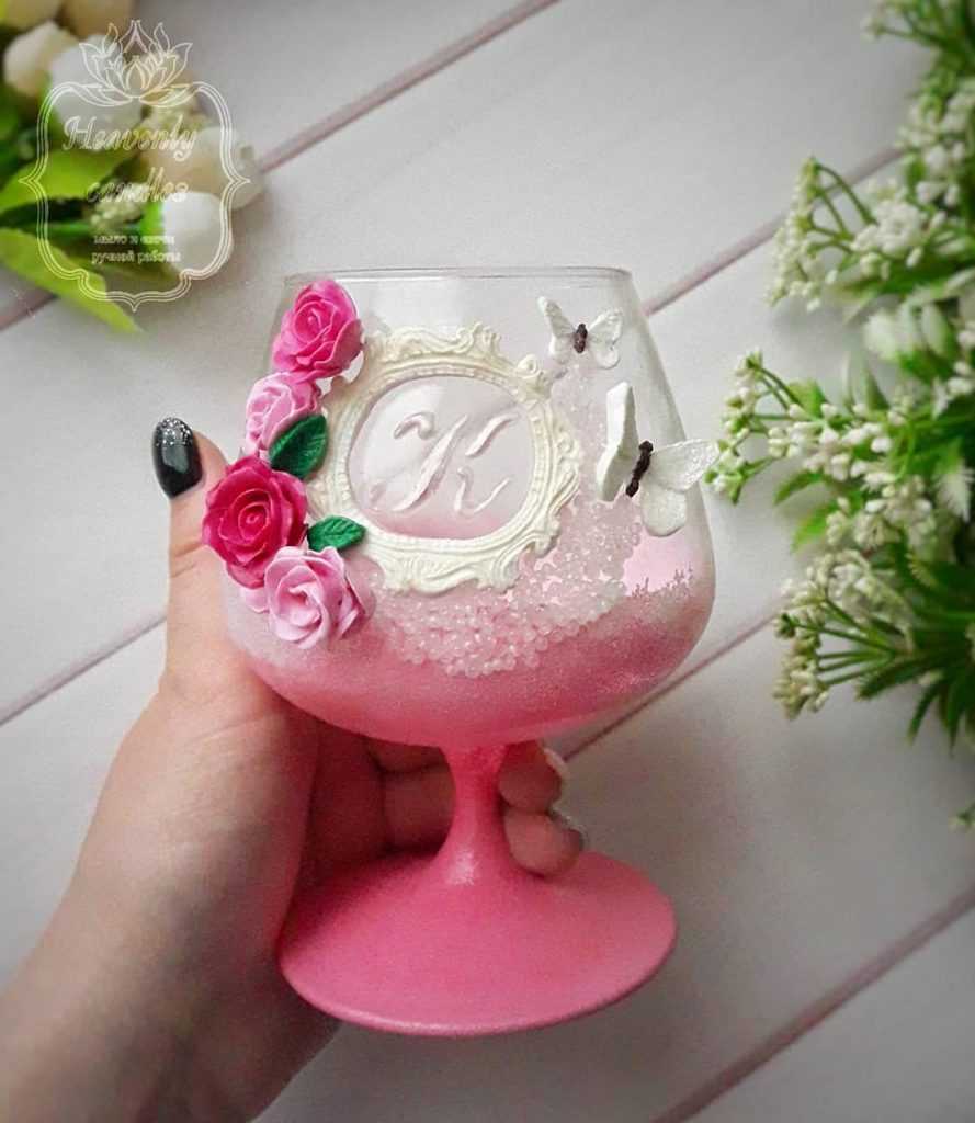 За основу работы можно взять также простую стеклянную вазу любой формы и размера. Вариантами для данного исполнения может послужить обычный высокий стакан или даже бутылка с широким горлом. Сам сосуд можно полностью покрыть полимерной глиной или оставить его прозрачным, лишь приклеив на него различные вылепленные фигурки.