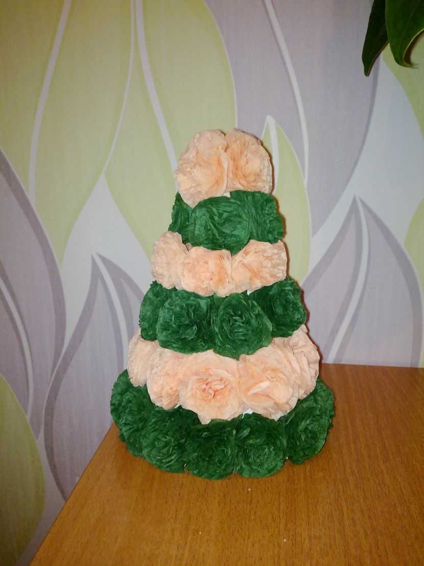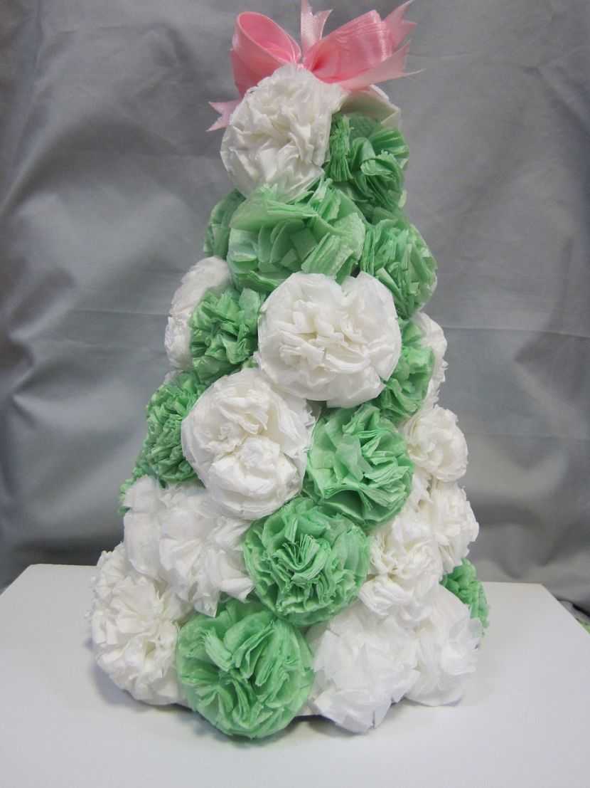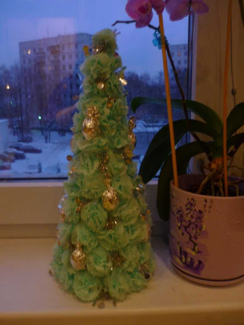 Из салфеток можно сделать маленькую бумажную елку на Новый год. Понадобятся материалы зеленых оттенков (можно даже сочетать несколько тонов, например, светлый и темный).