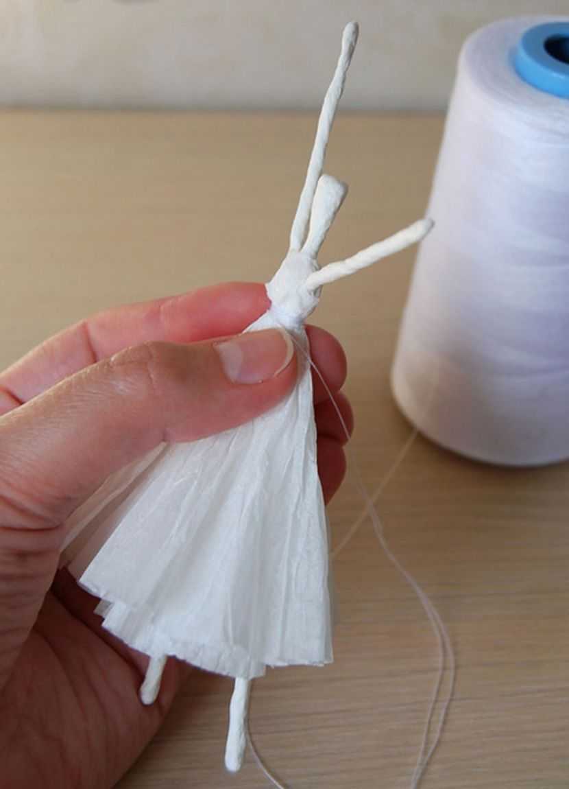 - Отрезаем проволочную нить длиной, равной диаметру салфетки. Сложите ее пополам, сделайте из верхней части петельку для головы будущей балерины. Нижние концы проволоки следует закруглить — это будут ноги. Чтобы фигура была больше похожа на женскую, добавьте немного материала для придания объема ногам и бедрам.