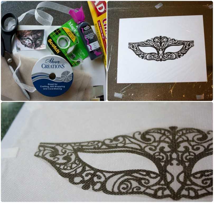 Нужны тюль, бархатная лента, канцелярский нож, чёрная краска, картон, пищевая плёнка, клей, скотч. Делается по следующему алгоритму: