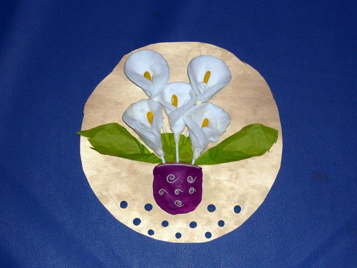- Положить перед собой ватный диск, а на него по центру — стебель с тычинкой, приподнять края диска по сторонам от тычинки и склеить, чтобы диск стал похож на белую каллу. При работе с суперклеем и клеем-пистолетом присутствие взрослого обязательно!