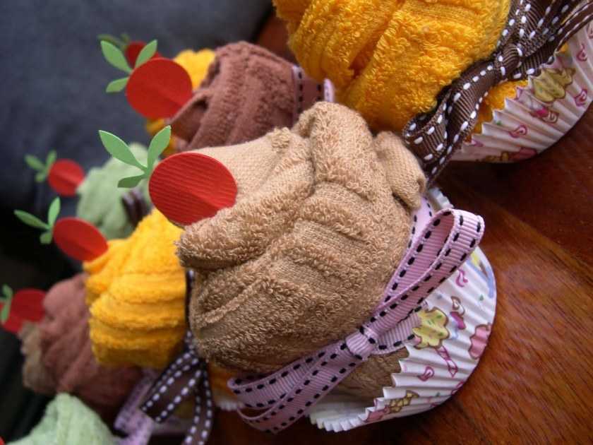 Если бабушка любит печь и готовить, для нее можно сделать поделку на день рождения, которая будет забавной, красиво оформленной и полезной — кекс из кухонного полотенца.
