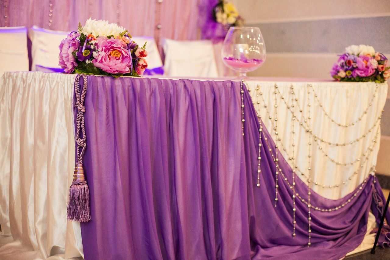 На стол жениха и невесты стелется однотонная скатерть, поверх которой закрепляется полупрозрачная складчатая ткань. Столы гостей и стулья декорируются однотонными плотными тканями одного цвета или сочетающихся оттенков. Расставить акценты помогают атласные, шифоновые или фатиновые ленты. С их помощью создаются яркие композиции позади молодоженов или на потолке.