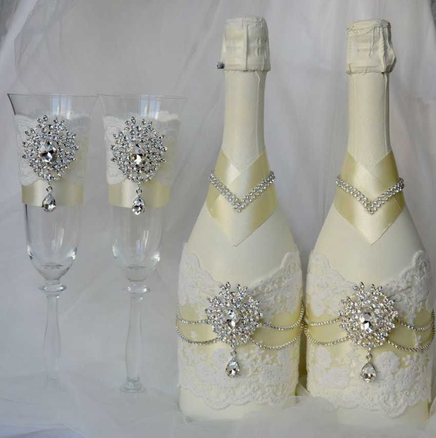 Можно дополнить ее бантами или бусинами – здесь уже работает фантазия. Получается скромный, но со вкусом украшенный бокал, который подойдет для любой свадьбы, как роскошной, так и в кругу друзей.