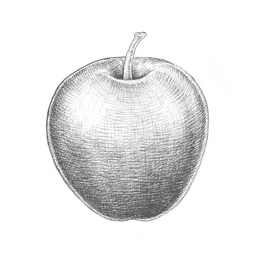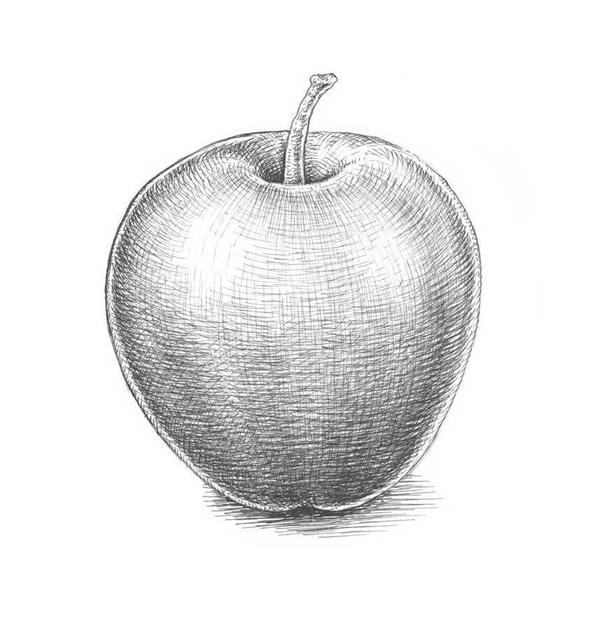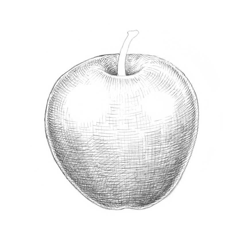 - Нанести небольшие штрихи (0,5 см) яблока внутри вдоль его контура. В области ветки основания необходимо нанести штрихи вдоль Нанести.