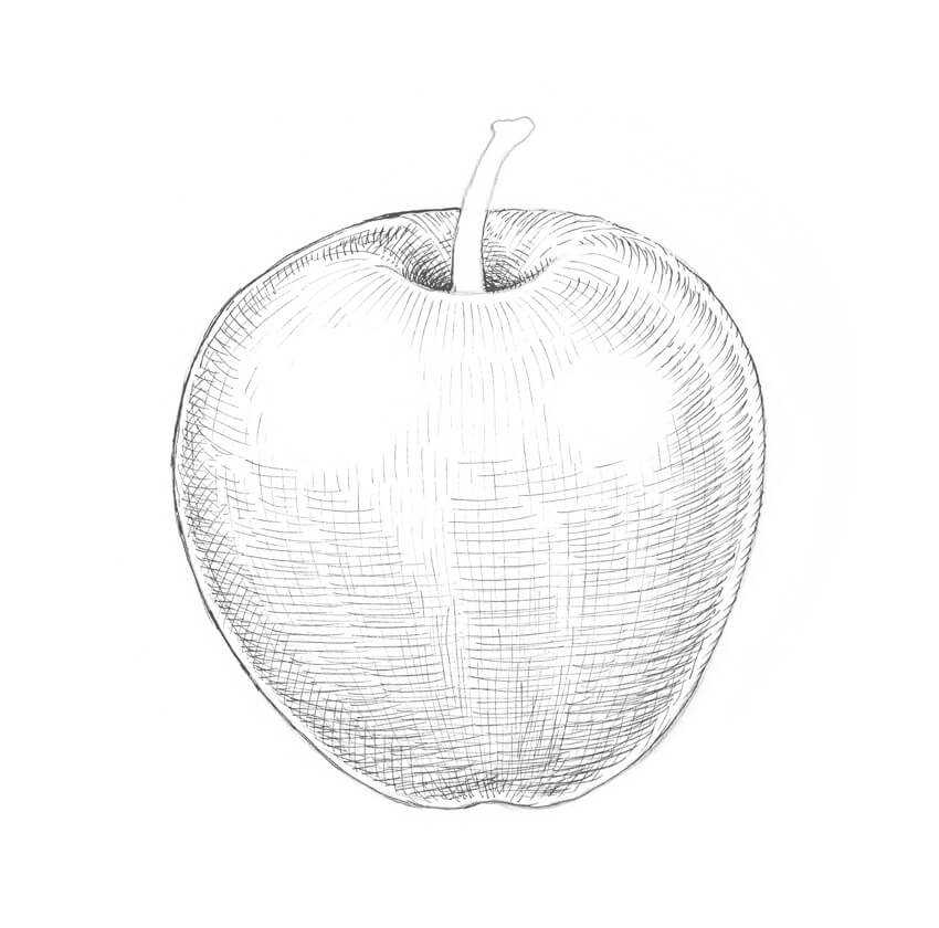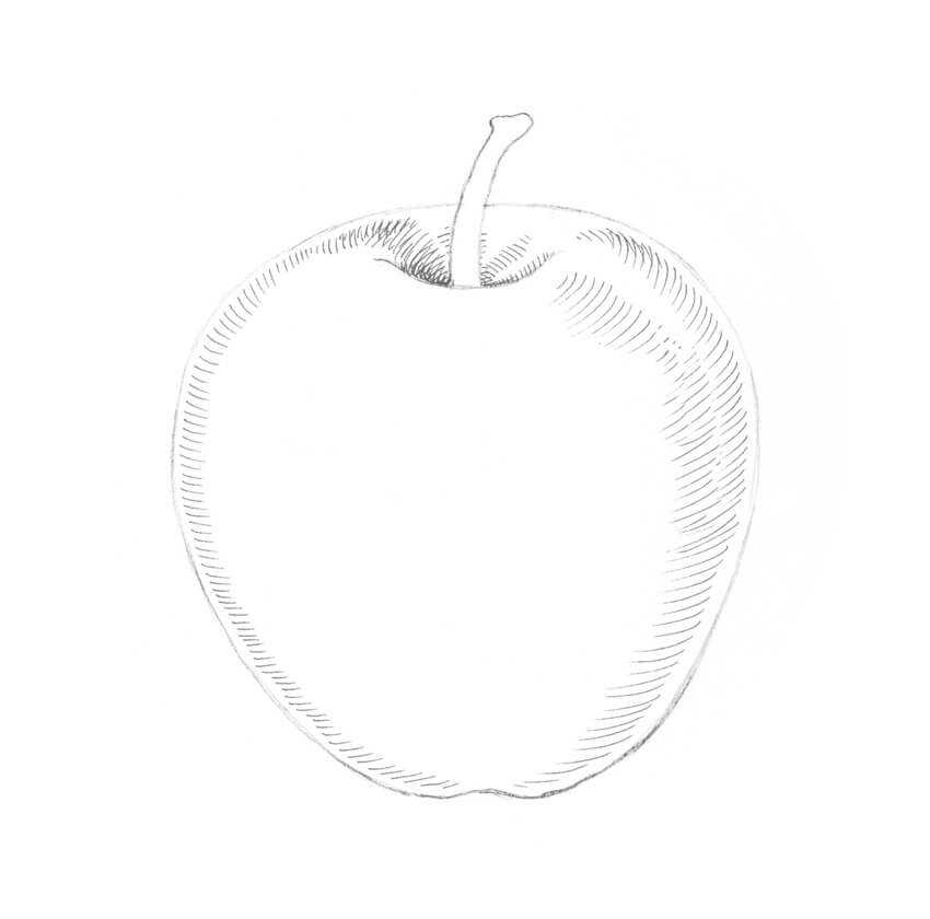 Снизу и справа штриховкой нанесем тени, после чего разметим поверхность, на которой лежит яблочко, и закрасим ее непосредственно под фруктом.