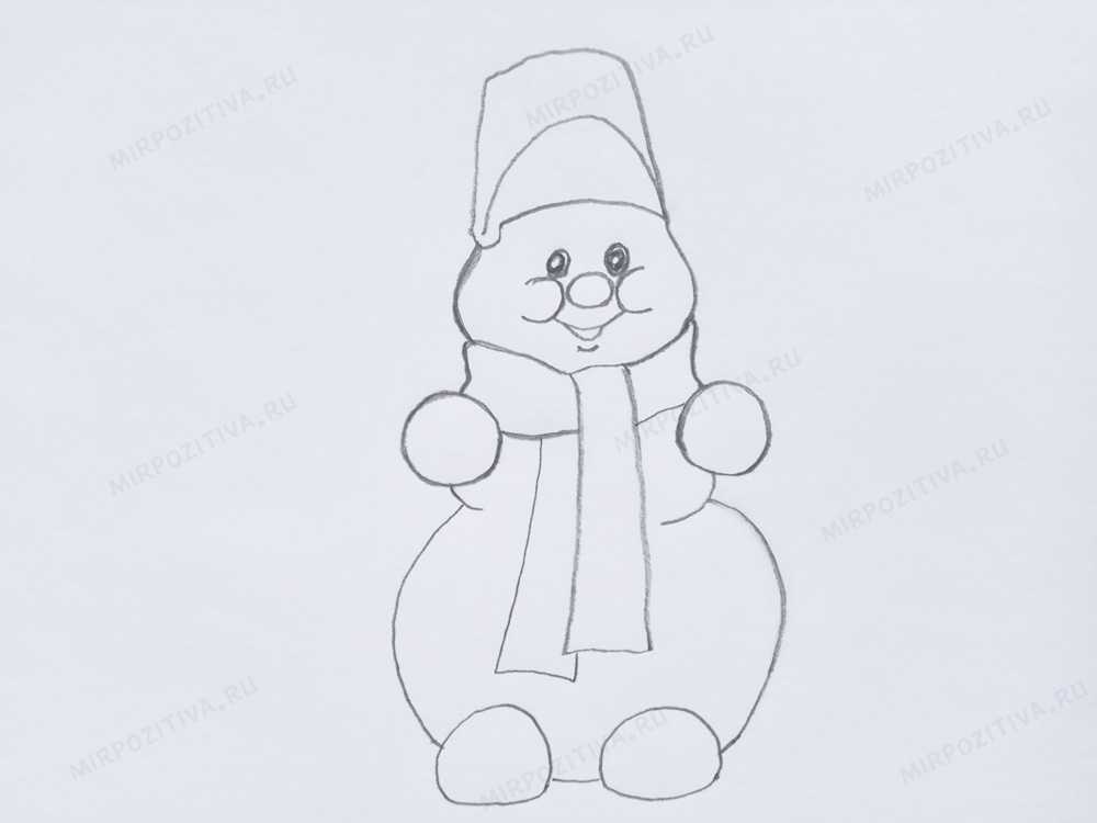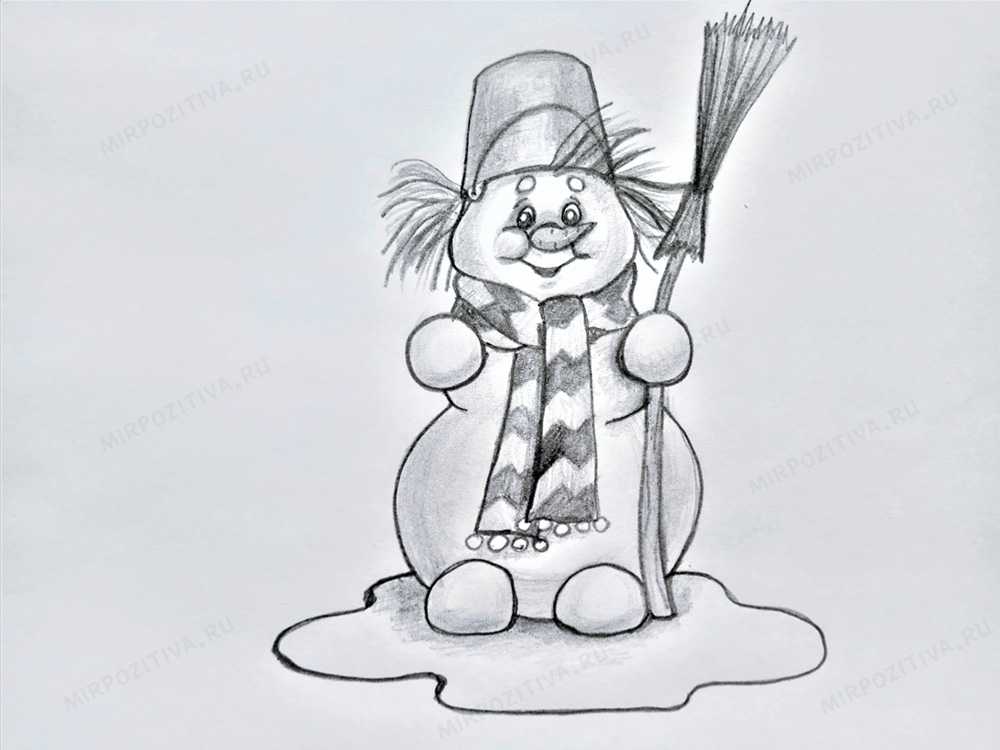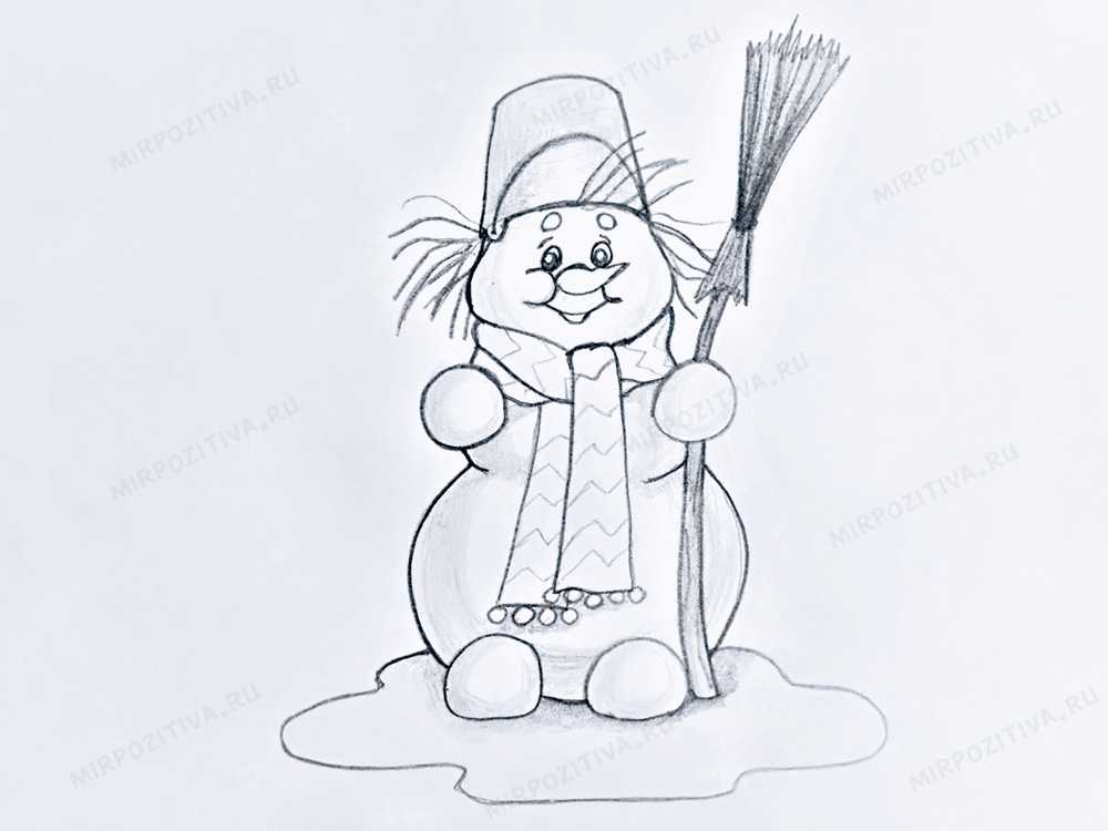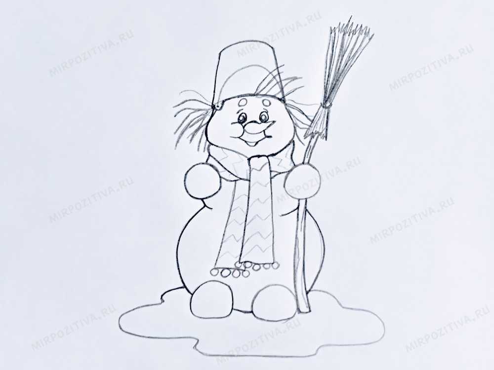Перейдем к деталям: обозначьте нос морковкой, прорисуйте брови и прическу отдельными прядями спереди и по бокам. Если сделать волосы подлинней, получится подружка зимы — снежная баба. На шарфе наметьте зигзаги и бахрому, дайте в руки снеговику метлу.