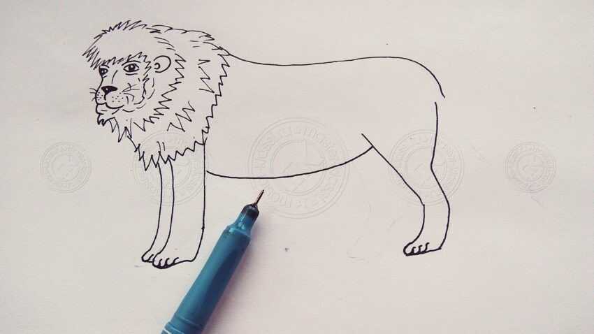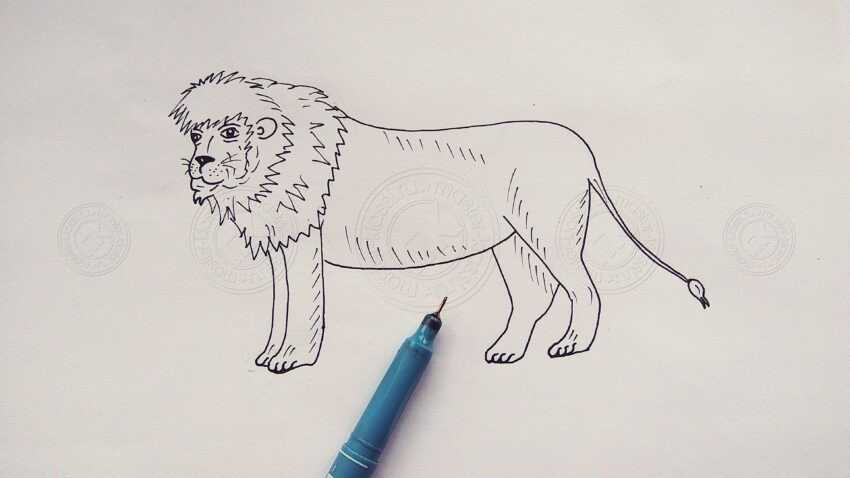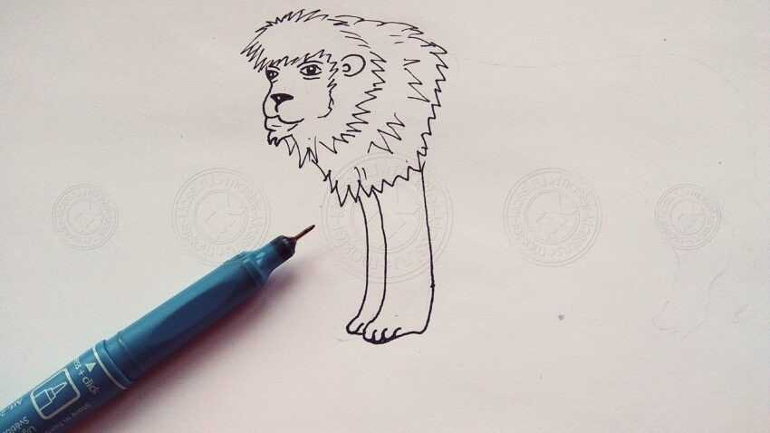 Еще раз обведем все контуры и нарисуем хвостик. На его конце есть кисточка. Это особенность льва.