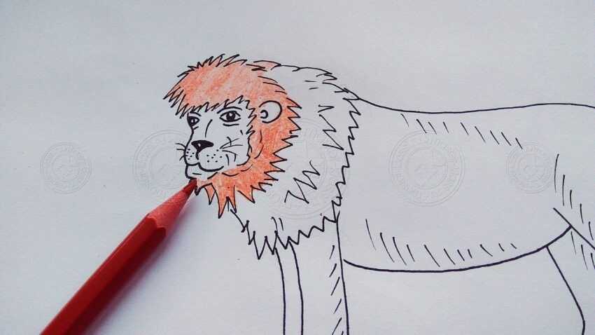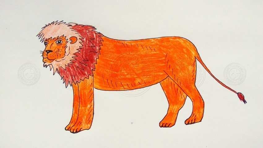 19. Морду, хвост, ноги и туловище животного раскрасьте оранжевым карандашом. Теперь перед вами рисунок льва, которого вы научились рисовать по этим подсказкам. Если же вы захотите показать львицу, то нужно модель немного изменить. Во-первых, главное отличие женской и мужской особей – это отсутствие гривы у первой. Во-вторых, львицу не нужно делать столь крупной. В общем, пробуйте, экспериментируйте, у вас все получится.