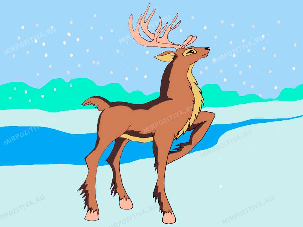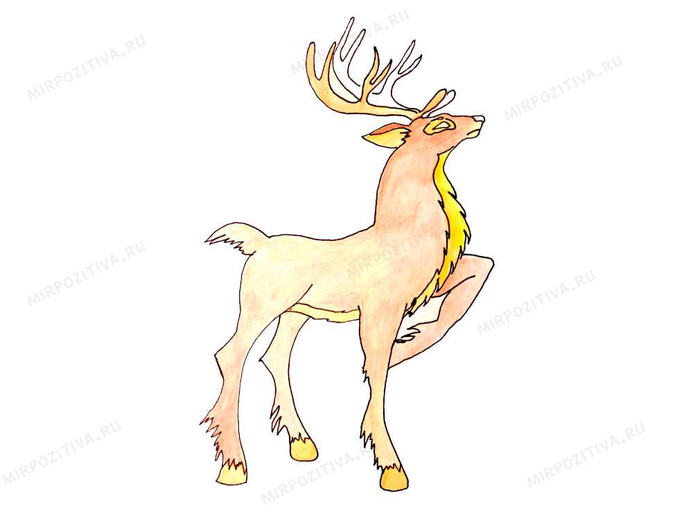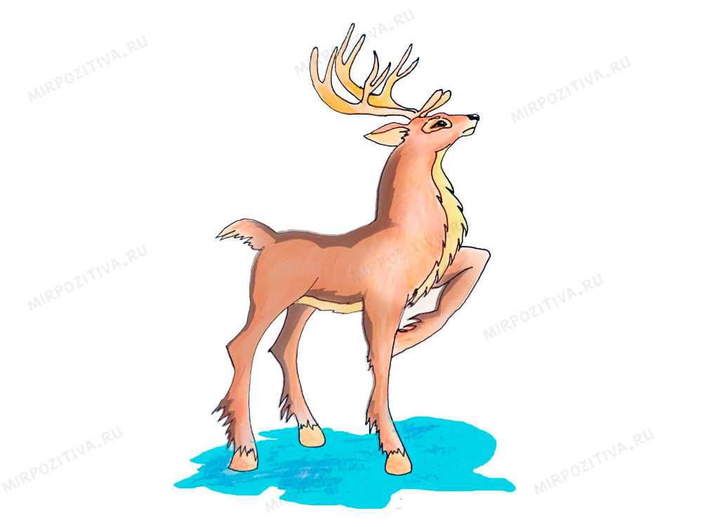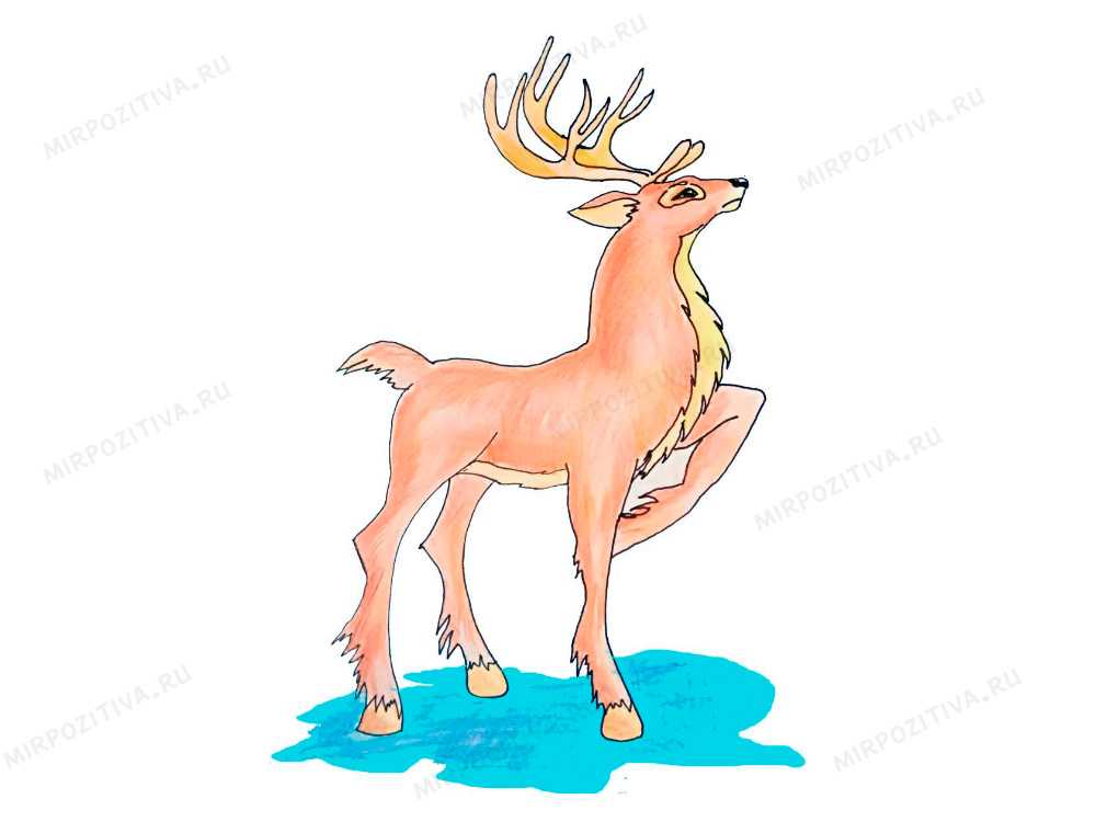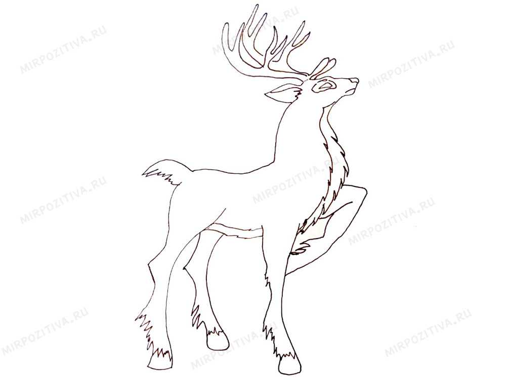 Шаг 4. Теперь очередь за деталями: нос, глаза, рот. Основное украшение оленя — ветвистые рога. Сделайте линии: вправо — короткие, влево — длинные.