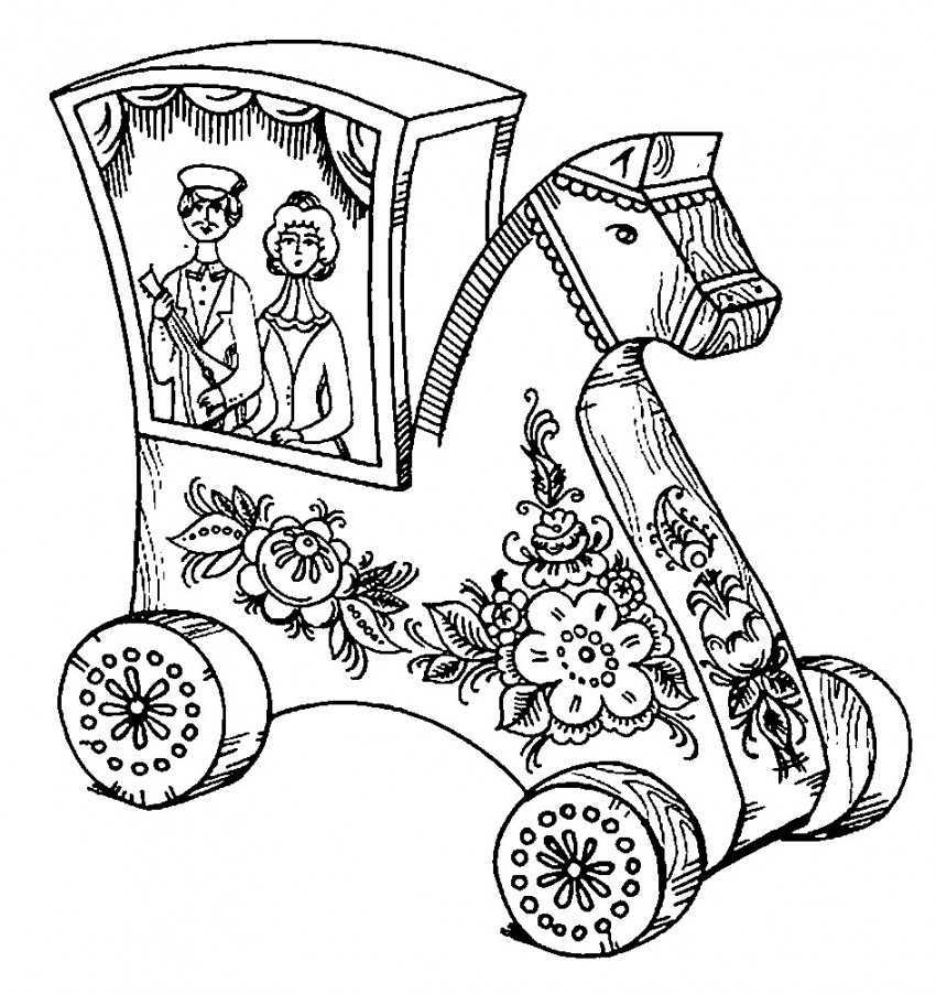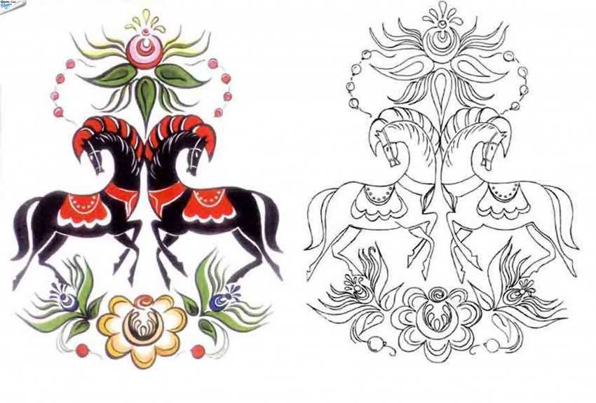 Городецких павлинов, петухов, вороных коней рисовать можно с нанесением предварительного эскиза карандашом. На ранних этапах получения навыков рисования можно использовать готовые шаблоны рисунков.
