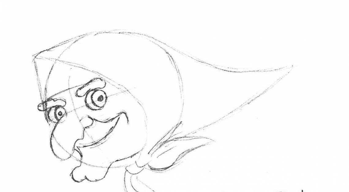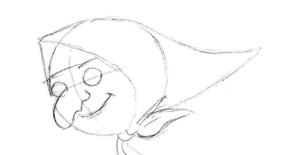Далее рисуем массивный крючкообразный нос и рот. При нанесении линий, образующих рот, старайтесь немного их выгнуть, как бы рисуя улыбку, ведь выражение персонажа, в конечном итоге должно получиться ехидным.