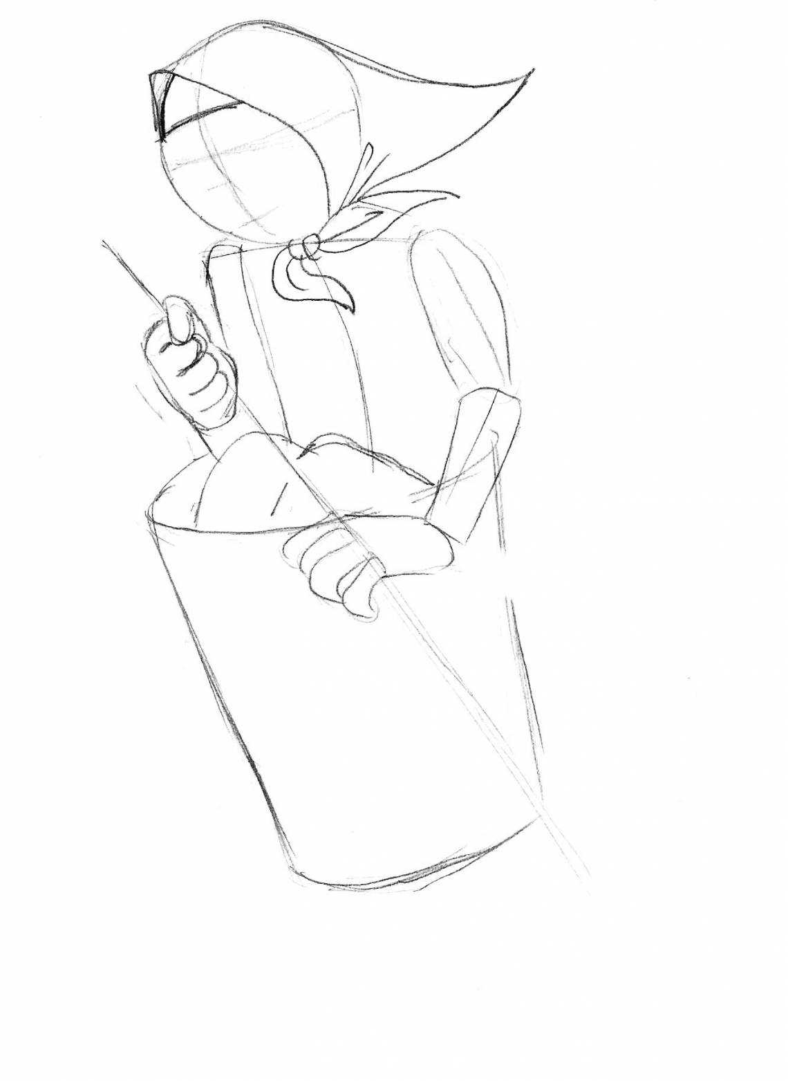 Приступаем к прорисовыванию частей тела. Руки нарисовать не сложно, несколько фигур в виде цилиндров – и руки готовы. Посложнее будет с кистями и выкрученными пальцами. Пальцы нужно прорисовывать так, чтобы акцент внимания падал на крепкое держание метлы. Сразу же нанесите несколько непрямых линий, соединяющих голову и плечи. Прорисуйте согнутые ноги.