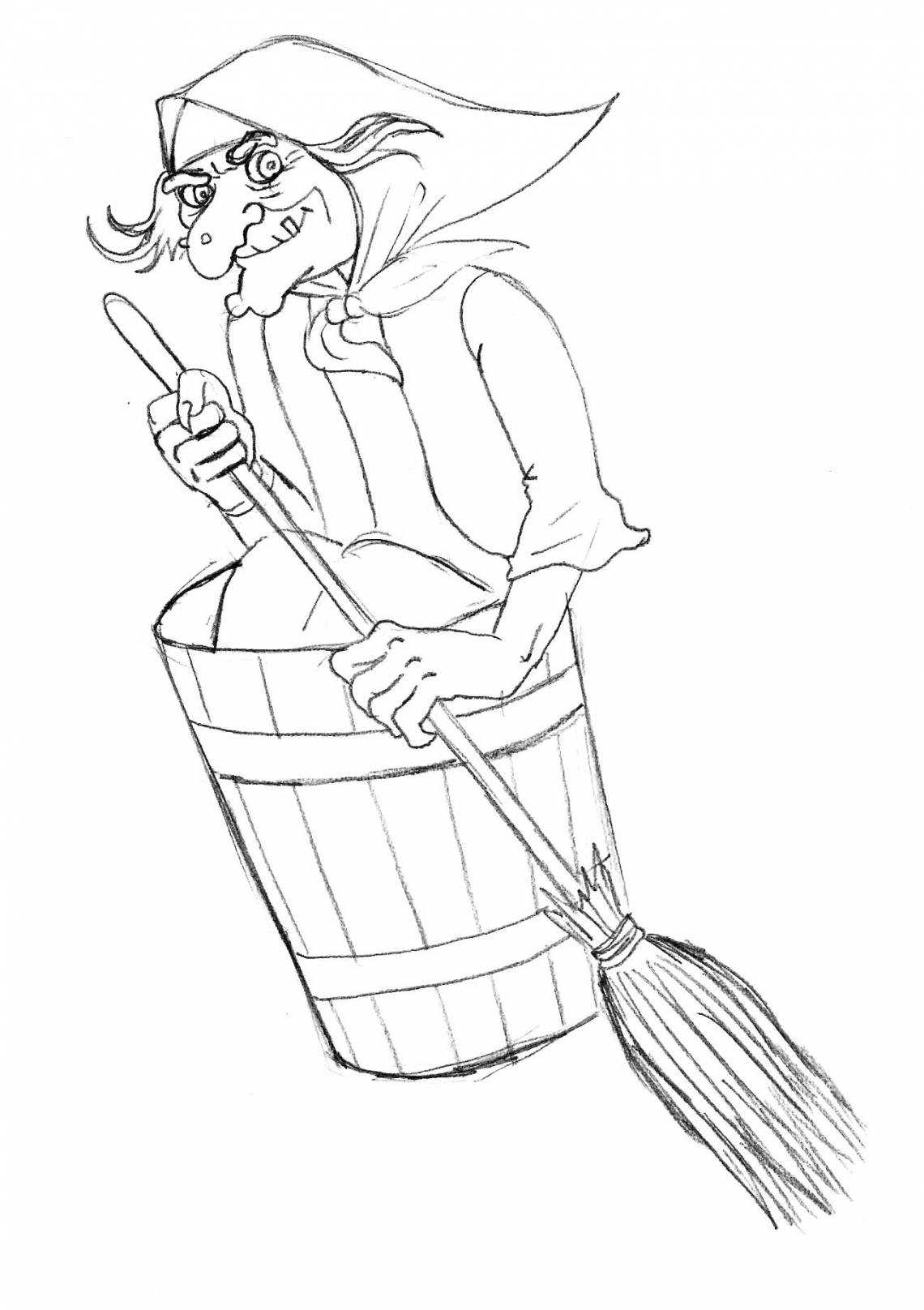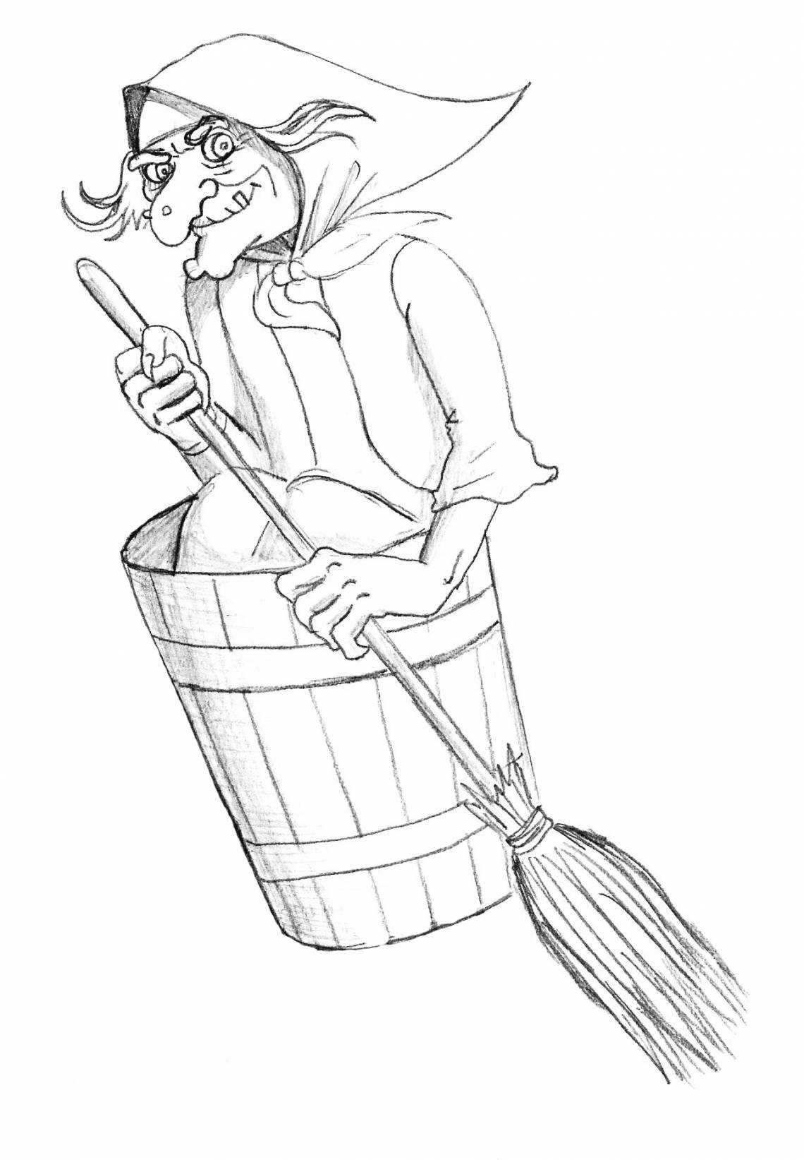 Дальше проще простого, несколькими длинными линиями нарисуйте саму метлу. Затем облагородьте ступу персонажа. Обозначив на ней доски и железные кольца.
