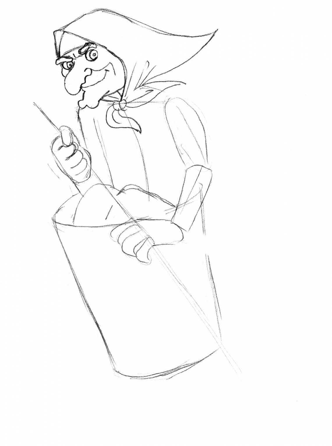 Всё это касается ближнего к нас рукава, дальнему требуется только придать необходимую форму. С туловища также сотрём лишние направляющие линии и закруглим контуры жилета. Поработайте также с кистями — прорисуйте пальцы так, чтобы получилась видимость того, что бабушка крепко сжимает ими метлу. Кстати говоря, нарисуйте и верхнюю часть самой метлы.