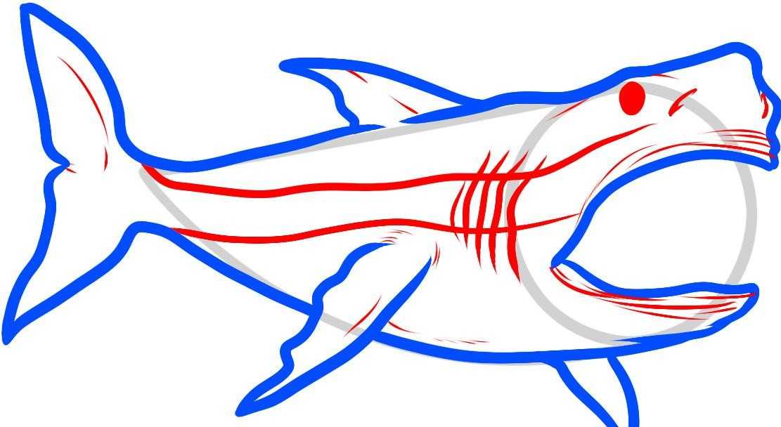 Далее нарисуем хвост и плавники. Туловищем этот гигант напоминает белую акулу, обитающую сейчас в морских глубинах.