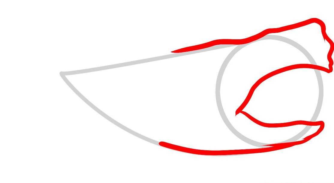 - Провести длинную дугообразную линию вдоль листа. Сверху добавить плавник в виде неправильного треугольника со сглаженным углом. В левой части сформировать нос. Нарисовать верхнюю часть пасти с помощью дуги, изогнутой к низу. Придать ей объём, при помощи линии, повторяющей дугу.
