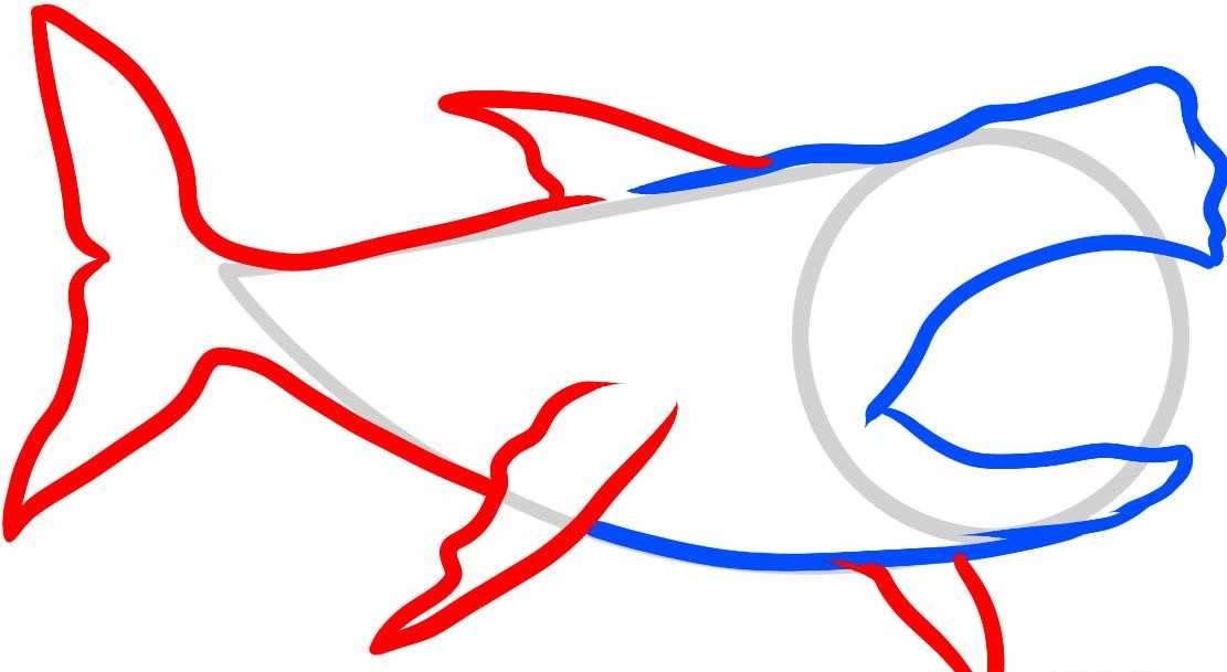 - Изобразить нижние плавники: дальний расположить чуть в стороне от нижней губы, ближний — от оскала, над ним черточками обозначить жабры. Дугой разделить спинную часть туловища и брюхо.