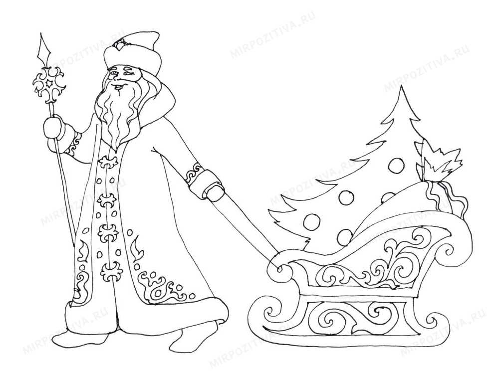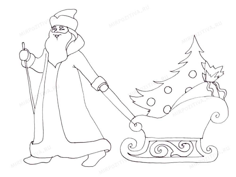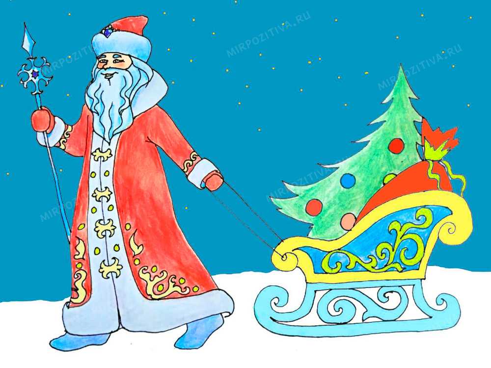 Поработайте над чертами лица, сделайте нашего героя улыбающимся. Возле глаз наметьте морщинки. Вложите в руку посох. В санях разместите мешок и новогоднюю елку.