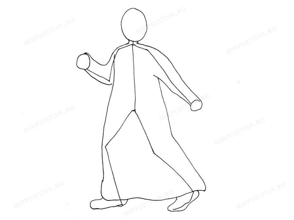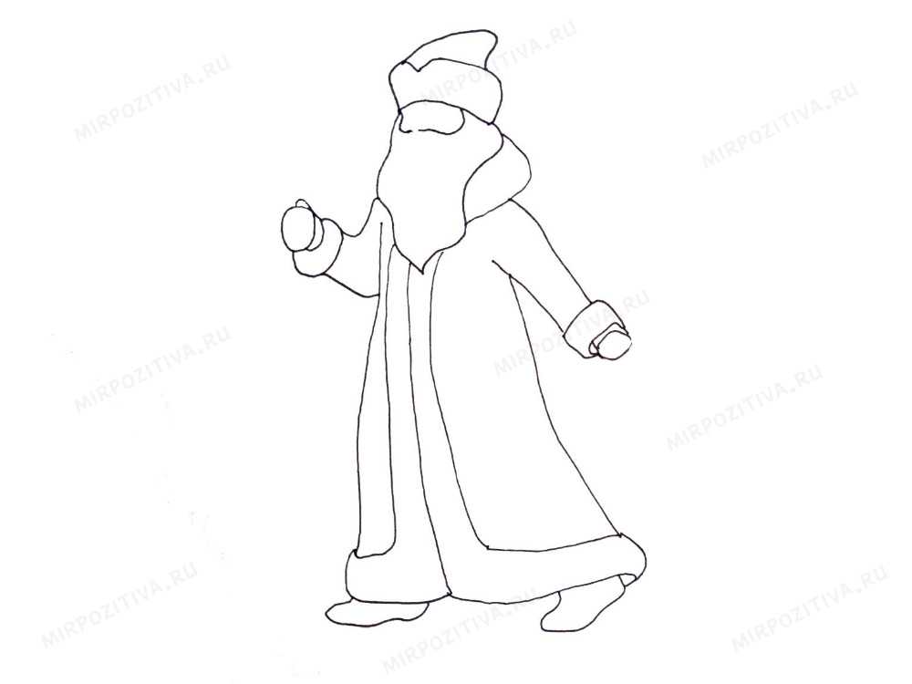 Теперь наденьте на наш персонаж длинную шубу. Для этого от плеч проведите линии рукавов по обеим сторонам, затем сделайте набросок боковых частей одежды вдоль туловища и ног. Нарисуйте валенки.