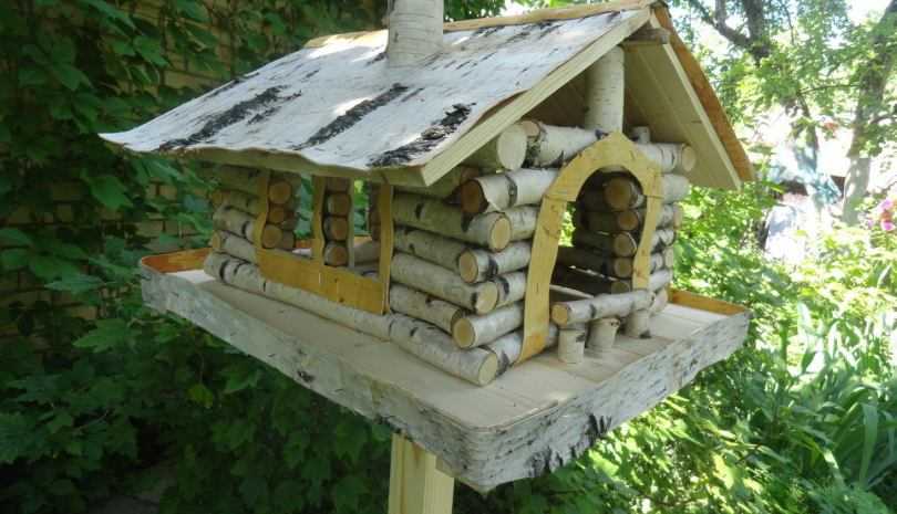 Гораздо лучше будет смотреться кормушка из дерева в виде домика. Она довольно прочная и гармонично вписывается в ландшафт. При желании можно создать уникальную постройку, которая станет украшением участка.