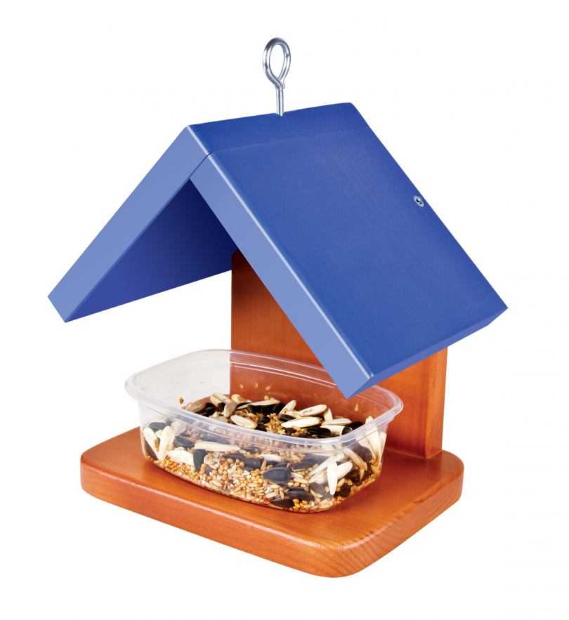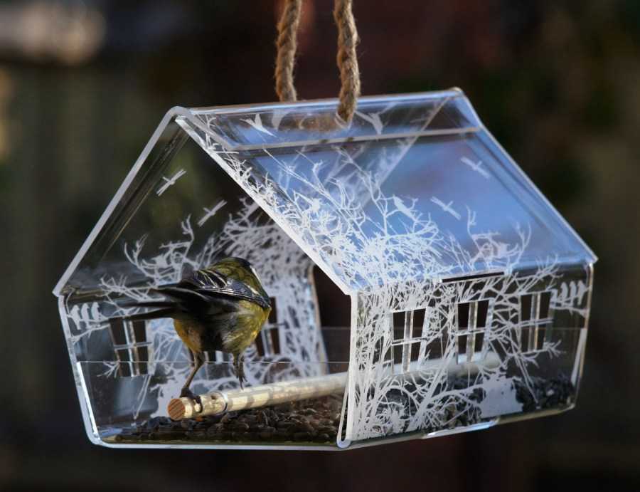 Простая деревянная кормушка-домикДомик-столовая дополнен подвесным мешочком с лакомствамиЯркие элементы на кормушке привлекут внимание птицДля изготовления кормушки можно использовать стеклянные сосуды — вазы, небольшие аквариумы, цветочные горшочкиЧтобы изготовить кормушку из кофейного сервиза, необходимо приклеить чашку к блюдцу и закрепить конструкцию за ручку