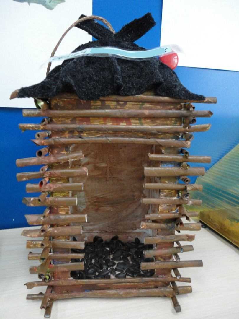 Найти тетрапак не составит труда – пакет из-под сока может послужить отличной кормушкой для пернатых. Если соединить пару узких коробок и проделать в них на разной высоте отверстия, то можно получить неплохую бункерную кормушку.