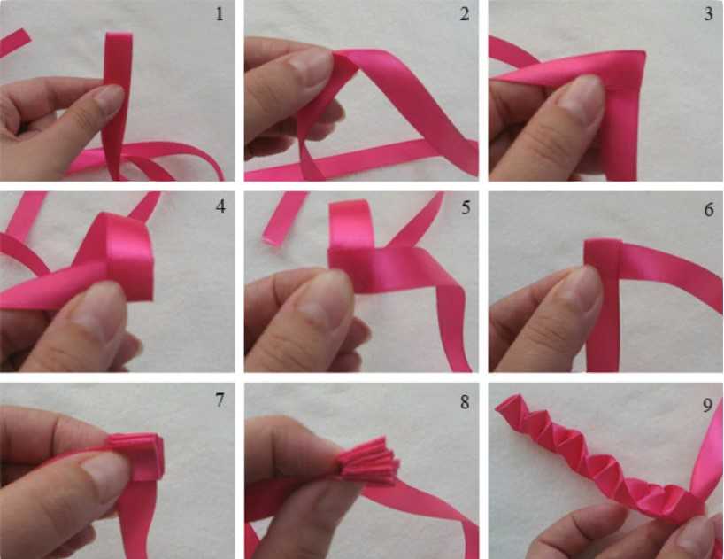 - Для формирования лепестка верхние углы ленты сгибаются вниз и все это собирается на нитку.