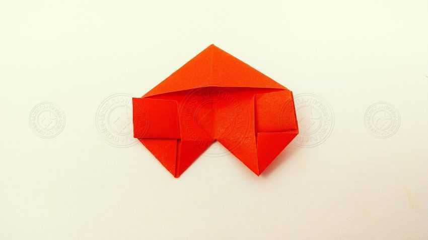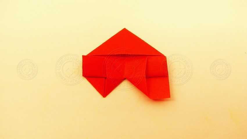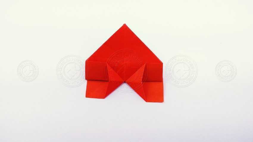Разворачивают полученную фигурку оригами в исходное состояние. Нижнюю кромку подгибают внутрь к горизонтальной линии сгиба в центре квадрата, чтобы наметить новую линию сгиба. Листок переворачивают лицом вниз, сгибают нижние углы к вертикальной линии. Затем заготовку оригами снова переворачивают лицом к себе.