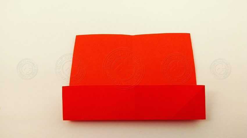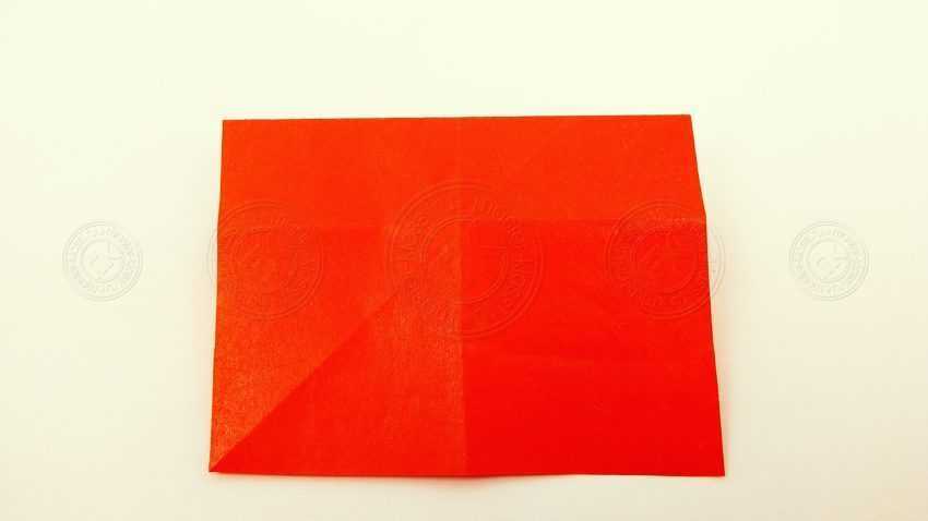 Описание: для работы понадобится квадратный листок бумаги любого цвета. Лучше всего подойдет двухцветная бумага, хотя для тренировки можно сделать несколько пробных экземпляров из обычной офисной. Листок складывают пополам. Затем еще раз, чтобы снова получился квадрат.