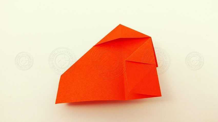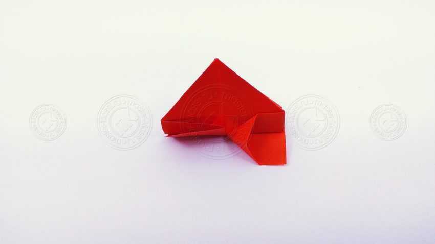 - Загибаем и направляем вниз верхний уголок бумаги, что позволит нам окончательно сформировать мордочку животного.