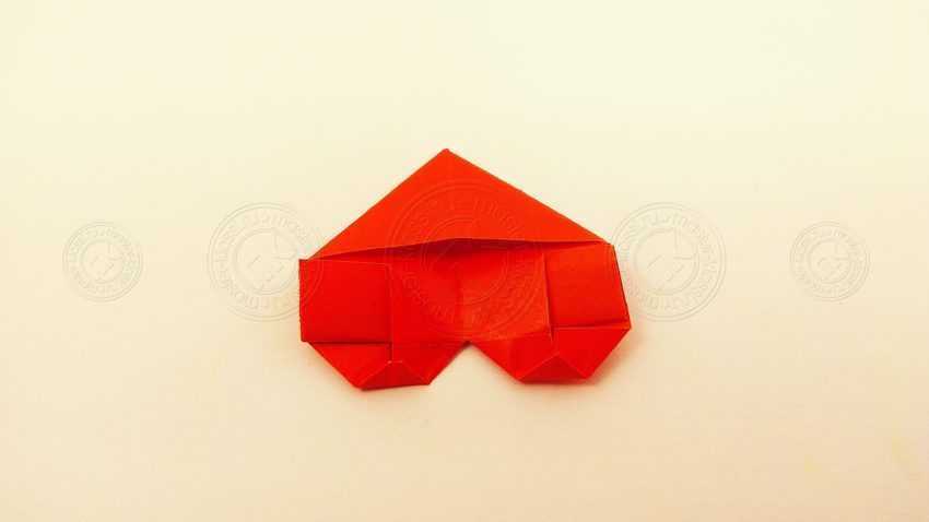 17. Переверните вашу заготовку, и вы увидите яркое алое сердечко со щелью по центру. Это и будет та модель, которую вы готовили, и которая станет замечательной валентинкой – поделкой, выполненной своими руками ко дню святого Валентина. Ее форма очень напоминает сердечко, знакомое всем. Останется придумать, что декорировать: маленькие подарочные коробки, открыточки или поздравить любимого с праздником.