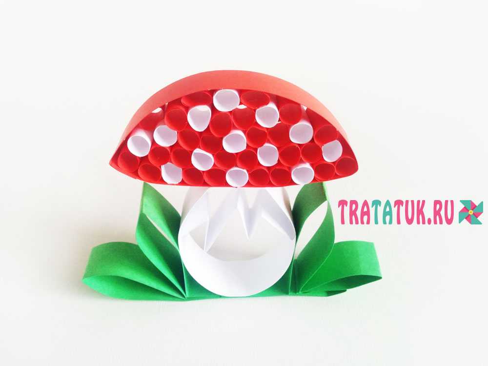 Смажьте клеем и поместите в оставленное место ножку гриба. Получится вот такой интересный и оригинальный мухомор из бумаги.