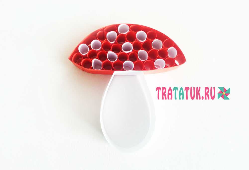 Теперь пора завершить шляпку бумажного мухомора. Для этого в созданную заготовку приклейте трубочки, ряд за рядом, чередуя 2 красные трубочки и 1 белую. Чтобы хорошо прижимать трубочки и при этом их не сминать, можно взять два карандаша. Один в предыдущей трубочке, а на второй надеваем трубочку, там же, на карандаше, смазываем клеем и приклеиваем. Но можно обойтись и без этого, если капать совсем немного клея ПВА, и не спеша заполнять шляпку, оставляя немного времени на высыхание клея.
