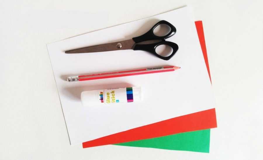 - Цветная бумага или картон: белого, красного и зеленого цветов.