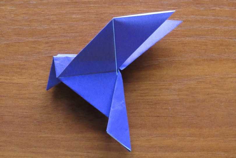 Чтобы создать крылья, нижний треугольник загибается вверх. Затем сгиб крыла вниз, совмещая с линией крыла и вверх, снова вниз вверх и еще два таких же сгиба. Так же делается и другое крыло. В передней части делаем голову. Наша птица готова!