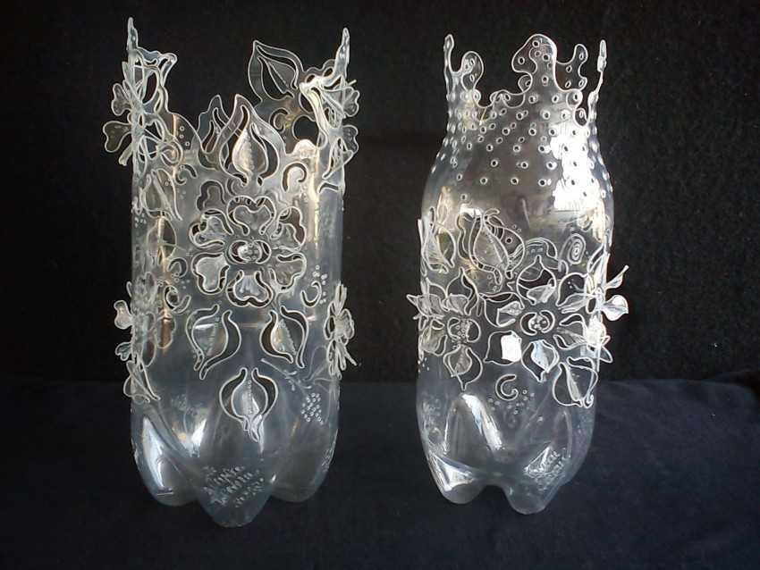 Красивая и современная поделка пластиковая ваза является также одним из самых доступных вариантов для создания. Чтобы ее сделать часто нужны только ножницы и сама бутылка.