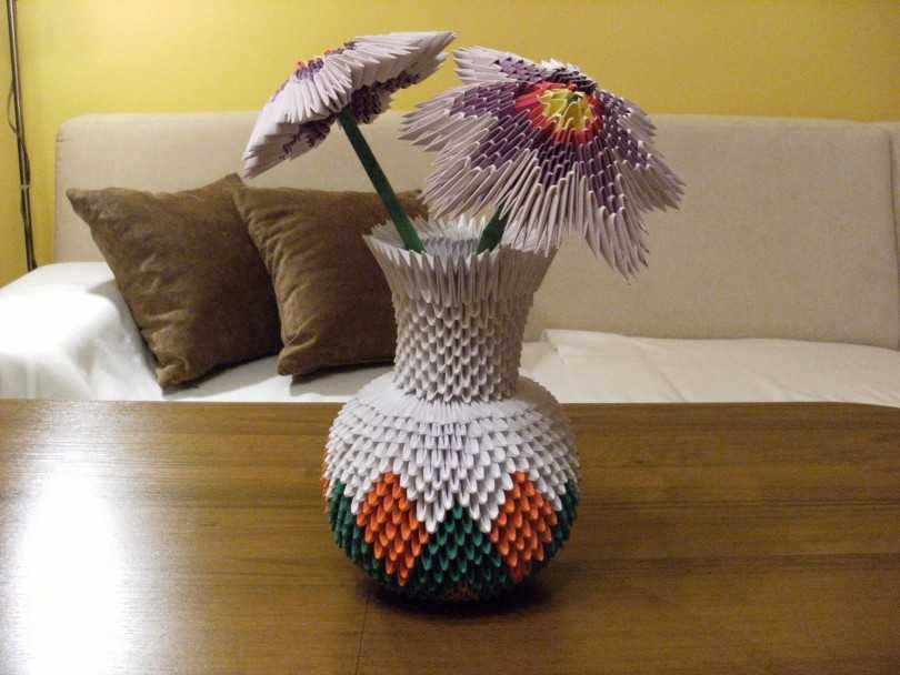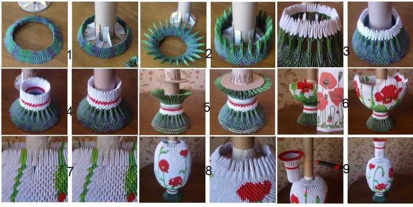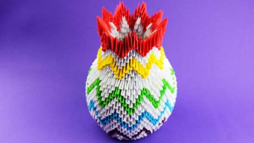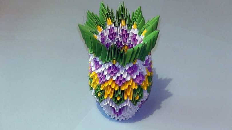Разнообразные схемы сборки вазы помогут каждой мастерице найти для себя что-то свое. Вазы могут быть маленькие и огромные – напольные. Очень популярны вазы, наполненные цветами фруктами, сделанными из модулей.