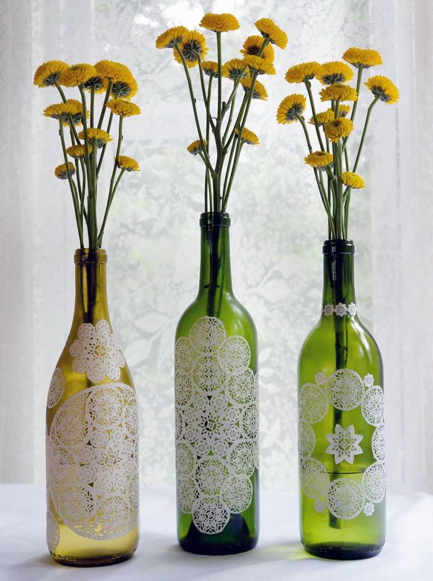 Оригинальные и необычные бутылочные вазы домашнего производства выходят при расположении шнура в виде витиеватого контура.