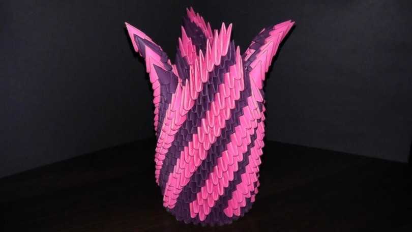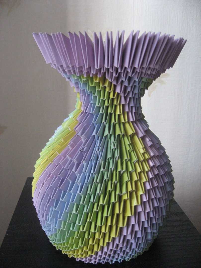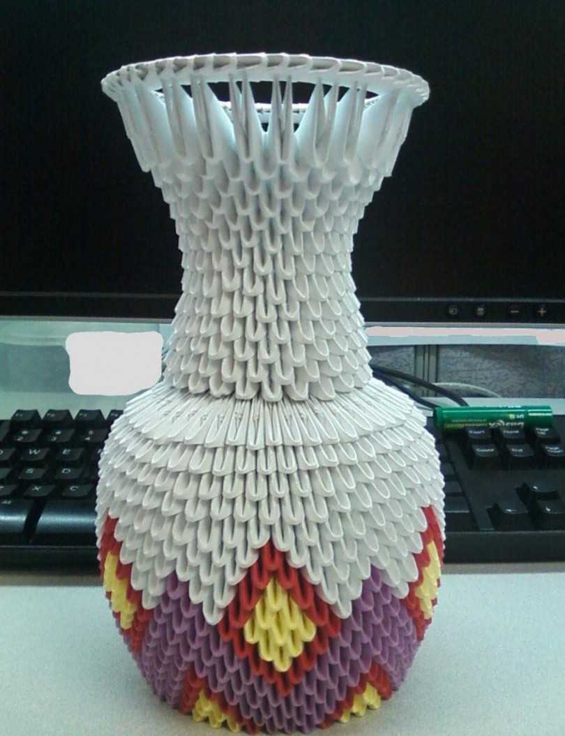 После того, как объемная ваза из бумаги собрана, снизу приклеивается картонное донышко. Поделка получается необычайно эффектной. При желании можно сделать модульное оригами из других цветов или расположив их полосами снизу вверх. Красиво будет смотреться любой рисунок, составленный из отдельных деталей. Например, цветок или ромбы.