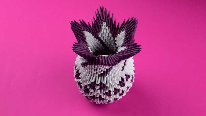 Ваза-оригами из модулей изготавливается в двух частях, которые затем соединяются между собой. «Тело» сосуда украшается узором из жёлтых и красных треугольников на фиолетовом фоне. Основное поле и горлышко имеют белый цвет. При желании можно выбрать другую гамму, работая по той же схеме.