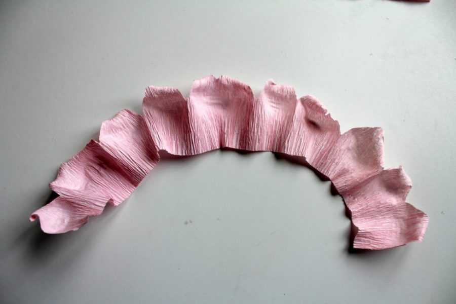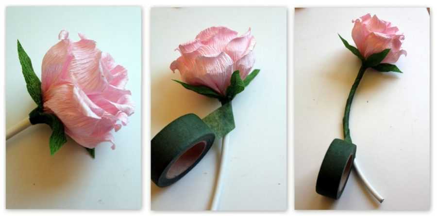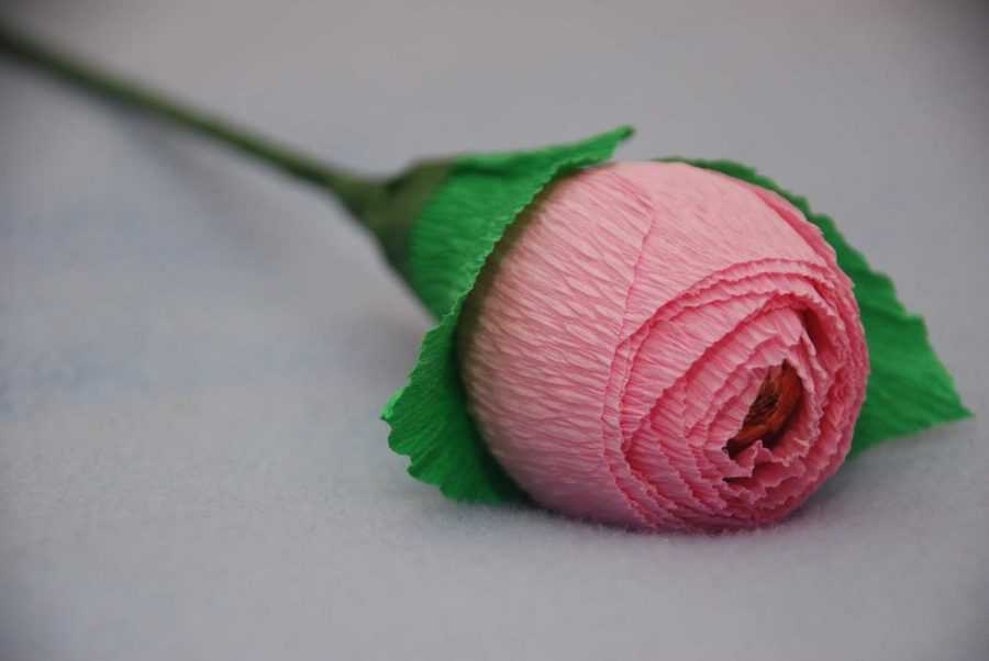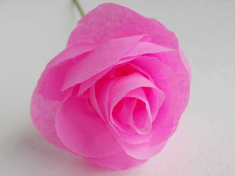 При помощи ножниц нужно вырезать 6-10 лепестков розы так, чтобы складки бумаги располагались вдоль заготовок. Далее серединки лепестков нужно растянуть, придав им чашеобразную форму, а концы слегка загнуть. Палочку нужно обклеить зеленой бумагой. Лучше всего вырезать тонкую полосу гофробумаги, складки которой будут идти вдоль короткой стороны, и, слегка растягивая, наклеить ее по спирали внахлест.