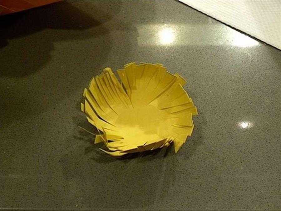 Далее нужно немного согнуть лепестки так, как показано на фото. Так как основания лепестков разрезаны на две части, их необходимо скрепить путём небольшого наложения одной части на другую.