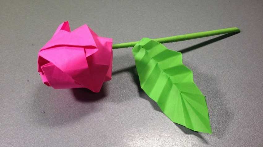 Берут 8 модулей, вставляют короткой стороной вниз. Верх модулей прижимают друг к другу, и бутон розы готов. Коктейльную трубочку обклеивают зелёной бумагой и приклеивают к бутону розы.