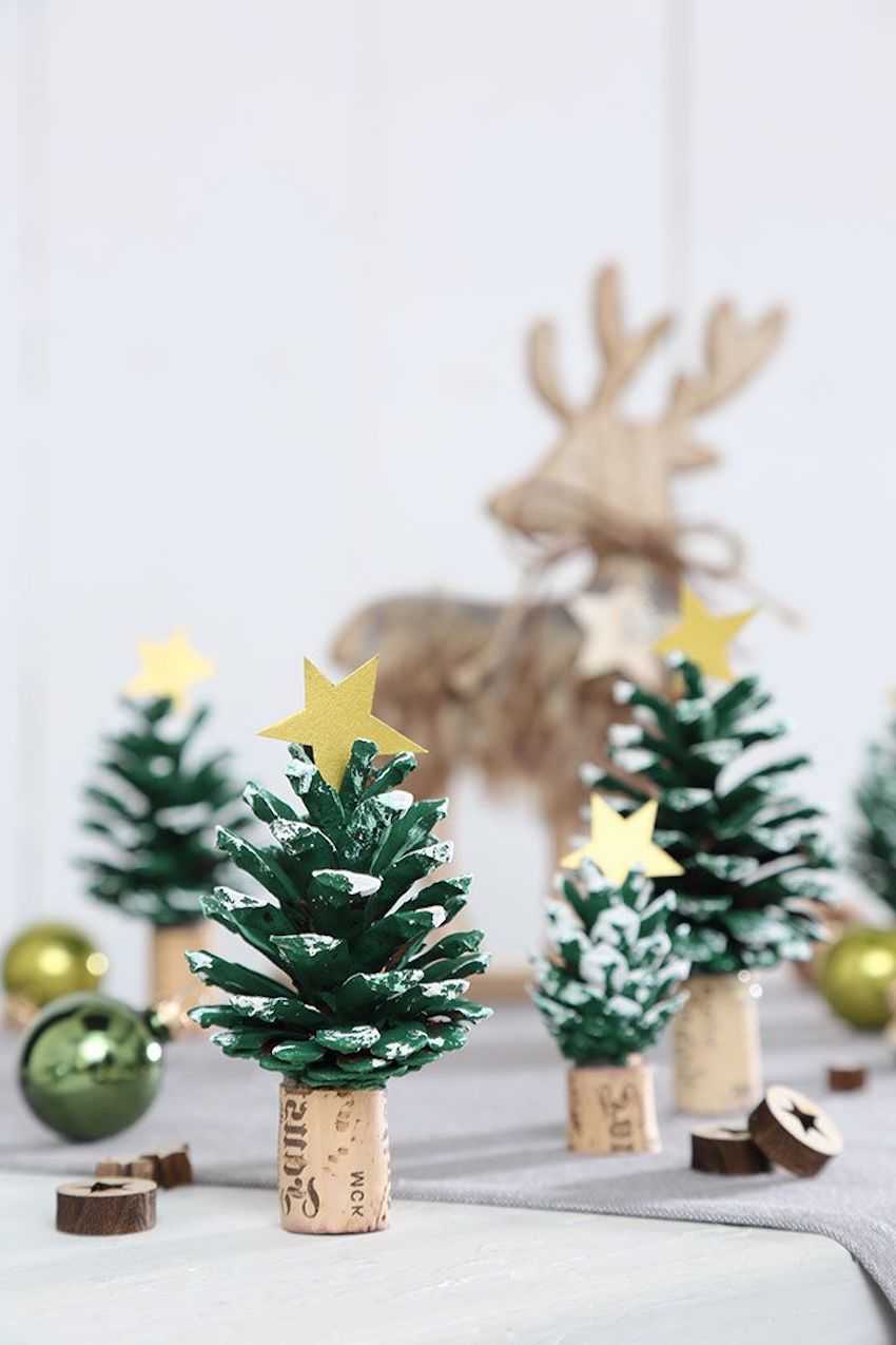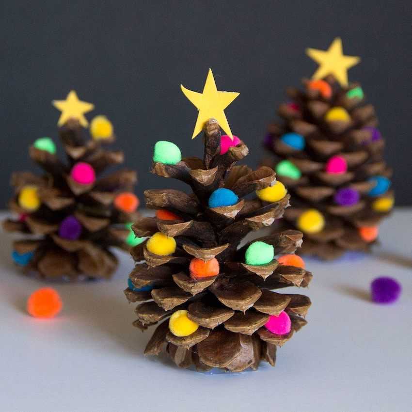 Симпатичный миниатюрные елочки сделанные из цветной бумаги, помпонов и шишек