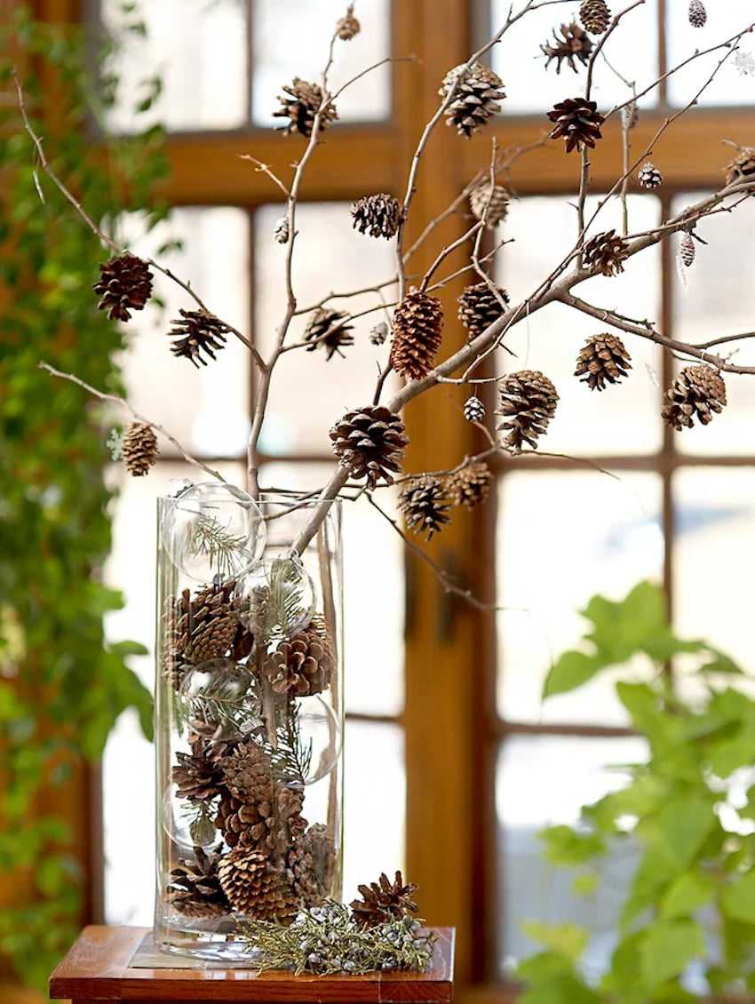 Собрав достаточное количество шишек, можно без труда самостоятельно собрать их в новогодний венок, дополненный яркими вкраплениями листьев, ягод, лент. При оформлении стола, полки шишки становятся центральным декором при создании композиций с прозрачными сосудами и свечой внутри.